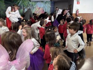 La sorpresa va arribar quan, de sobte, van aparéixer Blancaneu i els set nanets, que es van afegir a la festa per compartir les seues aventures al bosc. I no van vindre sols! El pati es va omplir de conillets, esquirols, papallones i altres animalets del bosc, que van donar un toc màgic i entranyable a la representació.